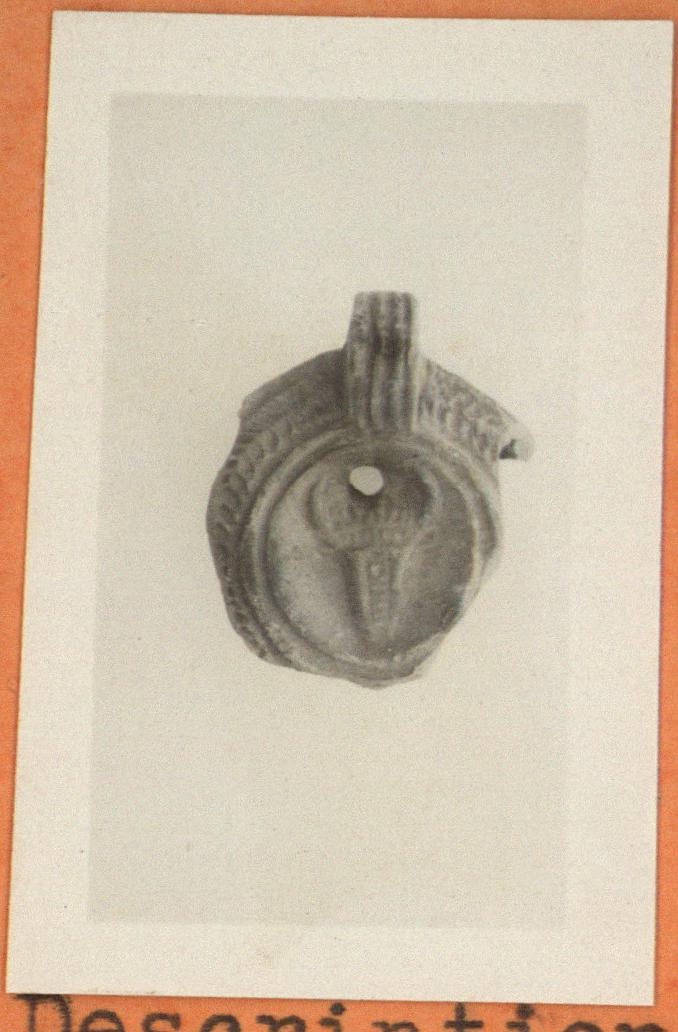 | Description: | Handle and part of top preserved. On rim, herringbone. On discus, boukranion with filling hole between horns. Handle solid, triple grooved above; double below. Thin brown glaze. Tan colored clay. Type XXVIII of Corinth collection. | |