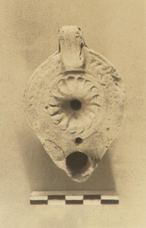 | Description: | Intact except for chips from nozzle. Herringbone pattern on rim, whirling rosette on discus. Solid grooved handle. Circular reverse with double concentric grooves containing small palm branch. Light red clay; wash (?). Type XXVIII of Corinth collection. | |