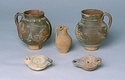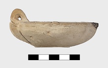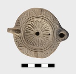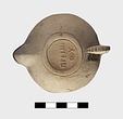 On discus, tongue rosette. On rim, panels, wavy lines, and raised dots. Handle pierced; three grooves above, one below; cross grooves at bottom below.