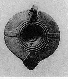 | Description: | Intact. On discus, fine rays. On rim, two grooves and row of dots at edge of discus; then plain with panels. Handle, pierced, three grooves above and two below; ivy leaf at base. On reverse, low ring foot, grooves; rosette. Unglazed. Pale buff clay. Type XXVII of Corinth collection. | |