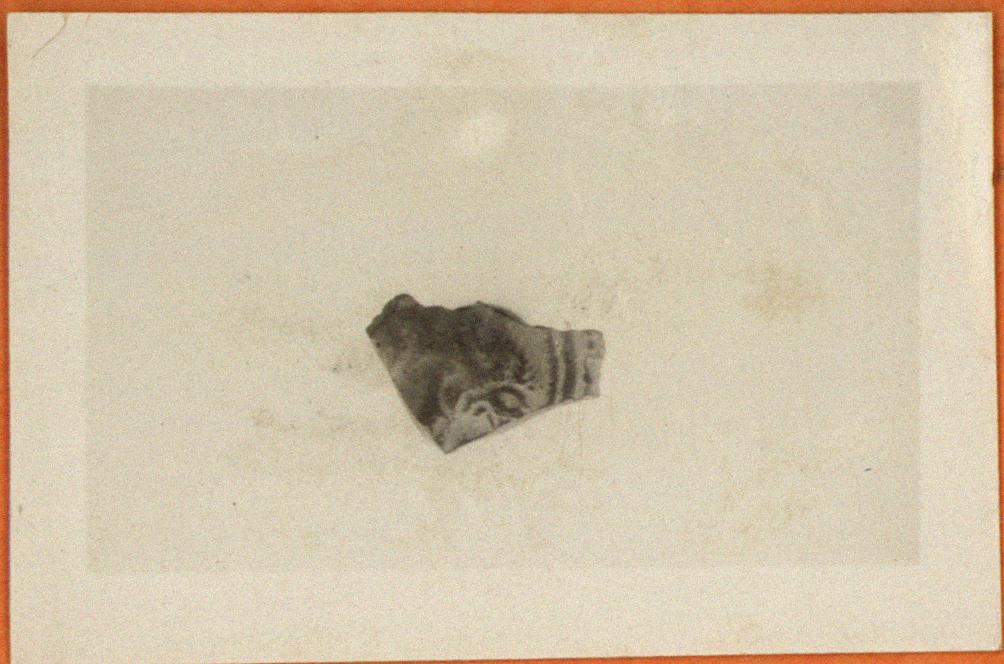 | Description: | Fragment of discus. On discus, figure of lion rampant. Thin purple glaze. Red clay. Type XXVIII of Corinth collection. | |