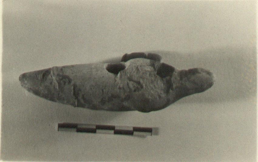 | Description: | In the shape of a membrum virile, with filling hole and wick hole above. For attachment to a figurine. Flaky brown clay and flaky red glaze. | |
