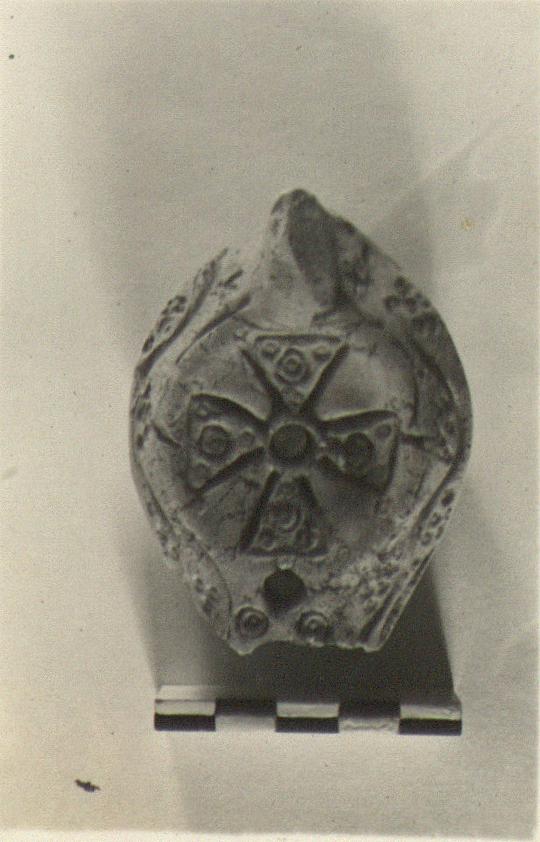 | Description: | Nozzle broken away. Discus jewelled maltese cross. Rim debased vine. Handle, small, solid. On base, palm branch heavily gouged. Red clay. Type XXIX of Corinth collection. | |