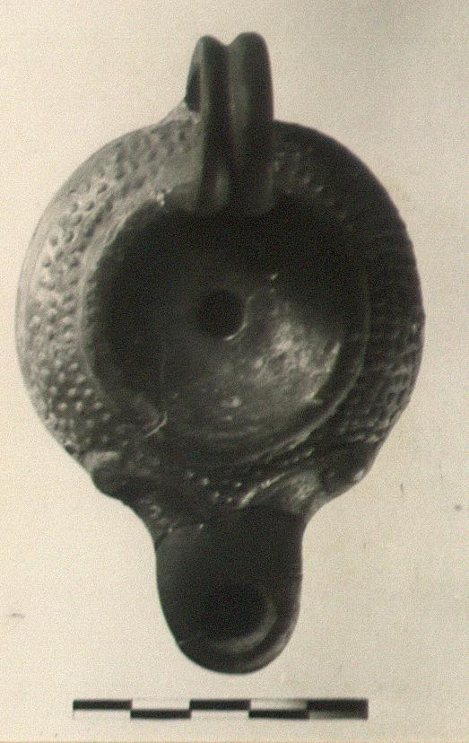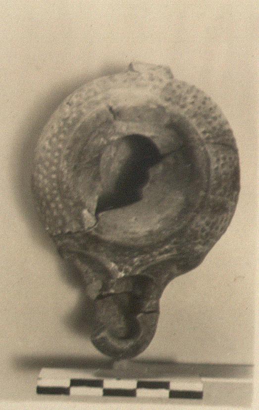 | Description: | Handle missing, and part of nozzle. "Alpha" beneath. Typical raised dots, small. Black to red wash, somewhat metallic. Type XX of Corinth collection. ADDENDA Numerous other examples of type XX of Corinth collection in Box. | |