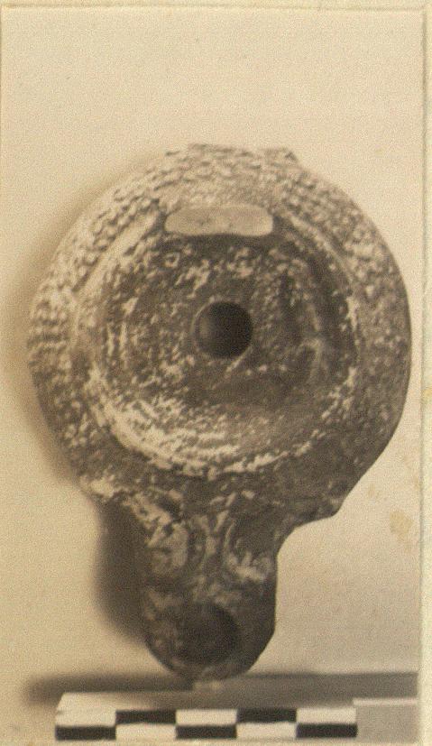 | Description: | Handle missing. Rounded body. Typical dots on body and rim; dull black glaze; underneath, "alpha". Type XX of Corinth collection. ADDENDA Typical example of which many almost complete in Box. | |