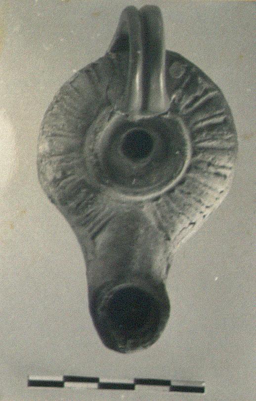 | Description: | Handle missing. Round nozzle; wide and narrow bars on shoulder. Beneath, "alpha". Poor purplish-black wash. Type XVIII of Corinth collection, type 53 of Agora collection. | |