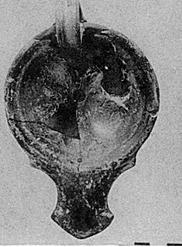 | Description: | Fragments of body and top missing. Relief in center uncertain; large rosette (?). Triangular nozzle. Low ring foot. Brownish glaze. Type XXII of Corinth collection. ADDENDA Fragments similar in Box. | |