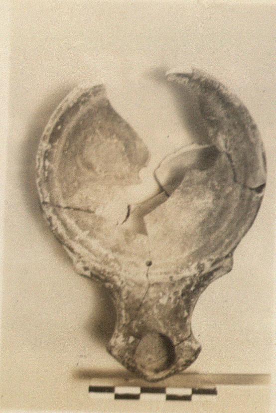 | Description: | Fragments of body and top missing. Relief in center uncertain; large rosette (?). Triangular nozzle. Low ring foot. Brownish glaze. Type XXII of Corinth collection. ADDENDA Fragments similar in Box. | |