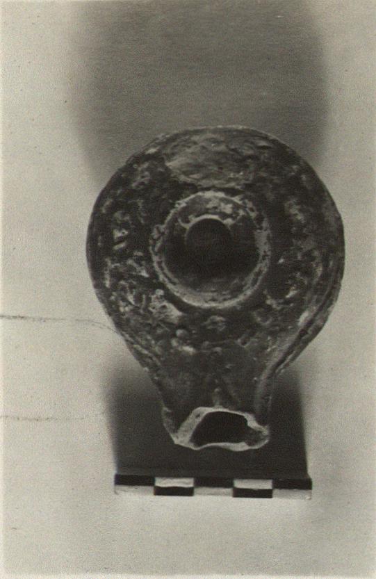 | Description: | Handle and end of nozzle broken away; otherwise intact. Pattern of ivy leaves on rim, dull black glaze rather rubbed. Type XVIII of Corinth collection, type 54C of Agora collection. | |