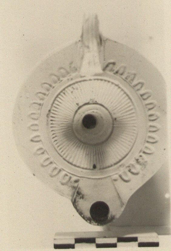 | Description: | Chip missing from wall and base. Rays on discus, eggs on rim. Handle grooved and pierced. Flat base outlined by groove and with two small grooved circles at center. Signature incised. Unglazed. Pale buff clay. Type XXVII of Corinth collection. <graphic> | |