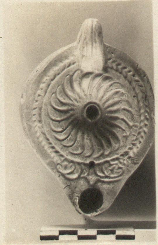 | Description: | Complete. On discus, whirling rosette. On rim, narrow herringbone. Handle solid, grooved. On lower side wall nodules; on bottom, concentric grooves. Thin red wash. Type XXVIII of Corinth collection. | |