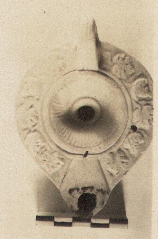 On discus, ribs. On rim, grape leaves and clusters. Handle pierced.