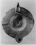 | Description: | Intact. Large lamp; pierced handle with a leaf at its base. Discus ribbed, with four small holes around the filling hole; on rim, panels and rosettes with tendrils twining around them. Underneath, signed. Unglazed. Fine fabric; buff clay. Type XXVII of Corinth collection. <graphic> | |