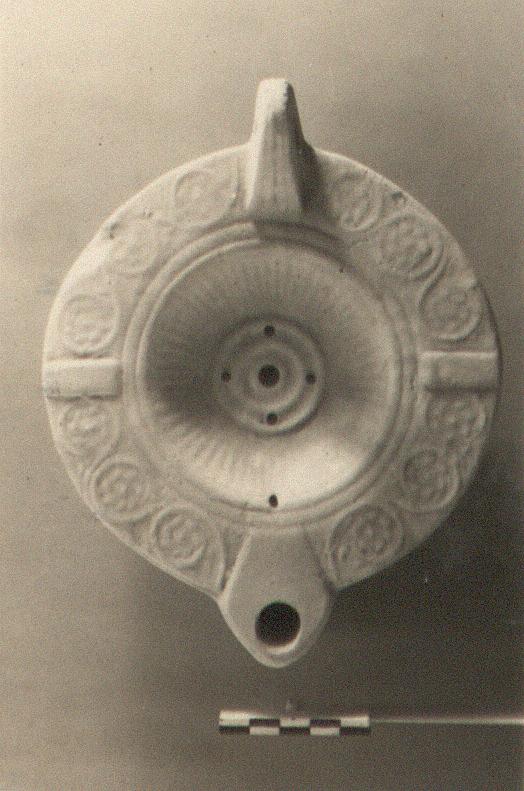 | Description: | Intact. Large lamp; pierced handle with a leaf at its base. Discus ribbed, with four small holes around the filling hole; on rim, panels and rosettes with tendrils twining around them. Underneath, signed. Unglazed. Fine fabric; buff clay. Type XXVII of Corinth collection. <graphic> | |