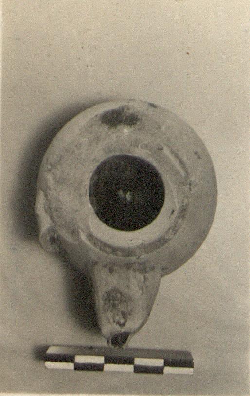 | Description: | End of nozzle broken off, and top chipped. Low base; pierced lug; groove around rim. Glazed inside only. Attic clay. Type VIIB of Corinth collection, type 25B' of Agora collection. | |