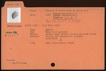 | Description: | Rear part of lamp only preserved. On rim, wavy lines. On reverse, within two concentric grooves, inscribed: "A". Handle, broken away above, doubly below. Thin purple glaze. Red clay. Type XXVIII of Corinth collection. | |