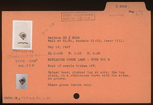 | Description: | Most of nozzle broken off. Miniature lamp; raised base; pierced lug at side; the top plain, in a continuous curve with the sides, no groove. Black glaze inside only. Type 25B' of Agora collection, type VIIB of Corinth collection. | |