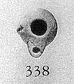 Miniature lamp; raised base; pierced lug at side; the top plain, in a continuous curve with the sides, no groove.