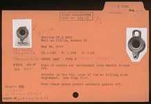 | Description: | Most of nozzle and horizontal loop handle broken off. Grooves on the top; edge of rim at filling hole depressed. Low ring foot. Poor black glaze almost entirely peeled off. Type V (third variety) of Corinth collection, type 24A' of Agora collection. | |