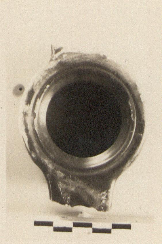 | Description: | End of nozzle and horizonrtal loop handle broken off. Ring foot; groove around insloping rim. Black glaze, somewhat worn. Type V (second variety) of Corinth collection, type 24A of Agora collection. | |