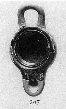 | Description: | End of nozzle and horizonrtal loop handle broken off. Ring foot; groove around insloping rim. Black glaze, somewhat worn. Type V (second variety) of Corinth collection, type 24A of Agora collection. | |