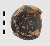 | Description: | Nozzle and handle missing. Broad slightly offset flat base; torus profile; horizontal strap handle. Dull black glaze, worn. Scratched in dry clay of under side. Type IV of Corinth collection, type 21C of Agora collection. <graphic> | |