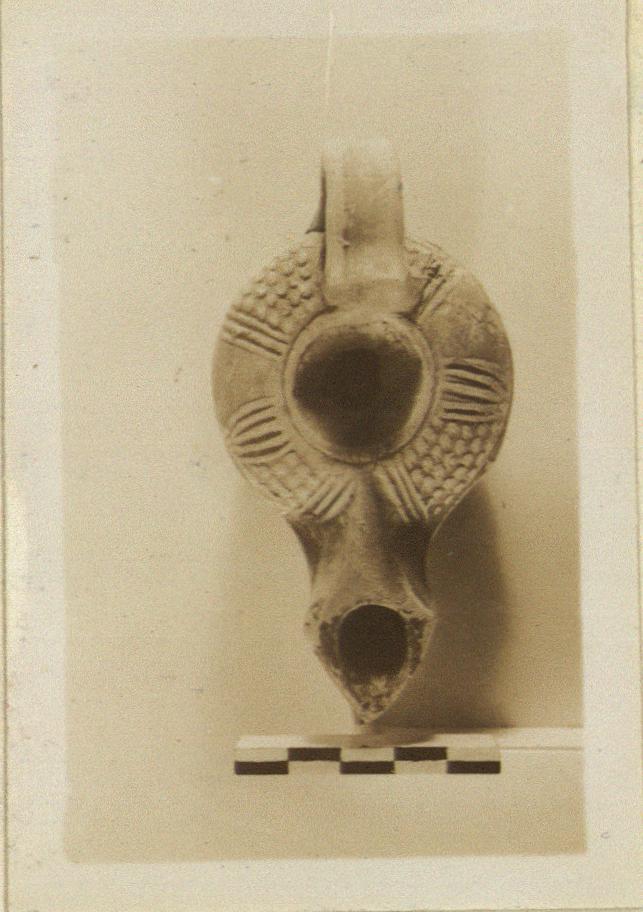 | Description: | Upper body divided into panels by groups of narrow ribs, the panels filled with small imbrications, two left plain. Red glaze. Type XVIII of Corinth collection, type 56B of Agora collection. | |