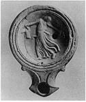 | Description: | On discus a frenzied maenad. She holds half of an animal in her left hand and a sword (?) in her right. The black glaze has almost entirely peeled off. Type XXV or XXII of Corinth collection. | |