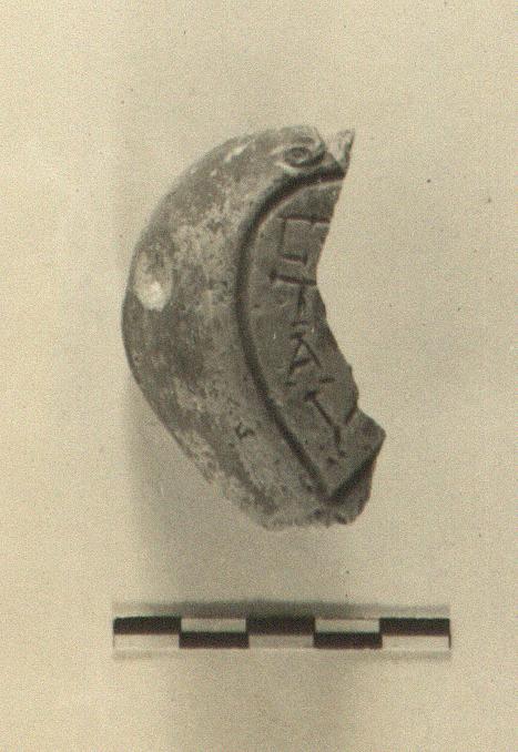 | Description: | Fragment of almond-shaped base only, with part of sides. Signed beneath. Brownish-red glaze. Light red glaze. Type XXVIII of Corinth collection. <graphic> | |