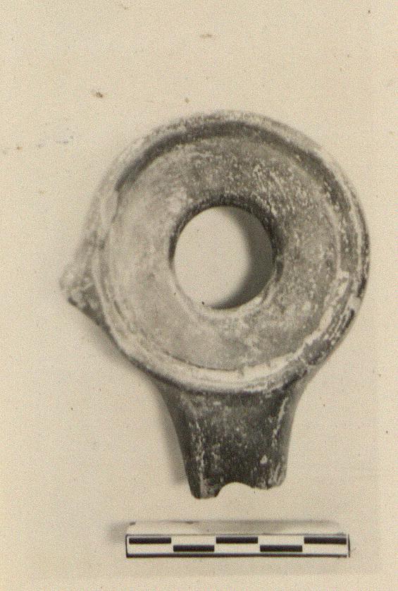 | Description: | The bottom, and the end of the nozzle missing. Straight side wall and flat rim, slightly inset. Pierced lug at one side. Mold made. Dull black glaze. Type XVI (glazed variety) of Corinth collection, type 43B of Agora collection. | |