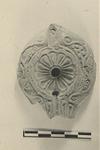 | Description: | Handle and nozzle missing; top of lamp preserved. Rosette on discus; narrow channel on neck with flutes on either side. On rim, which curves down all around, as in Hellenistic lamps, a scroll pattern featuring debased bunches of grapes, vineleaves, and stems. Thin reddish glaze. Red clay. | |