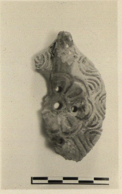 | Description: | Part of top only preserved. On discus, rosette; on rim, wavy grooves. Handle unpierced, two grooves above. Unglazed. Red clay. Type XXVIII of Corinth collection. | |