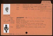 | Description: | Tip of nozzle missing. Double convex body, with concave top. Wheel made. Rising vertical band handle, broken at back; long nozzle. Slightly rising bottom, with central raised disc; base indicated by groove setting off body from under surfrace. Metallic black glaze, much peeled. Pale pinkish-buff clay. Type XII (early speading variety) of Corinth collection, type 34 of Agora collection. | |