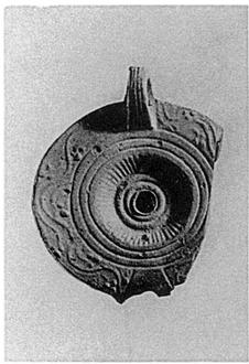 | Description: | Nozzle, and part of side wall broken away. Pierced grooved handle. Tendrils, with berries, on the rim; three grooves around discus. Discus sharply depressed; ridges around filling hole. Trace of signature, within two circular grooves, on reverse. Unglazed. Pinkish-buff clay. Type XXVII of Corinth collection. <graphic> | |
