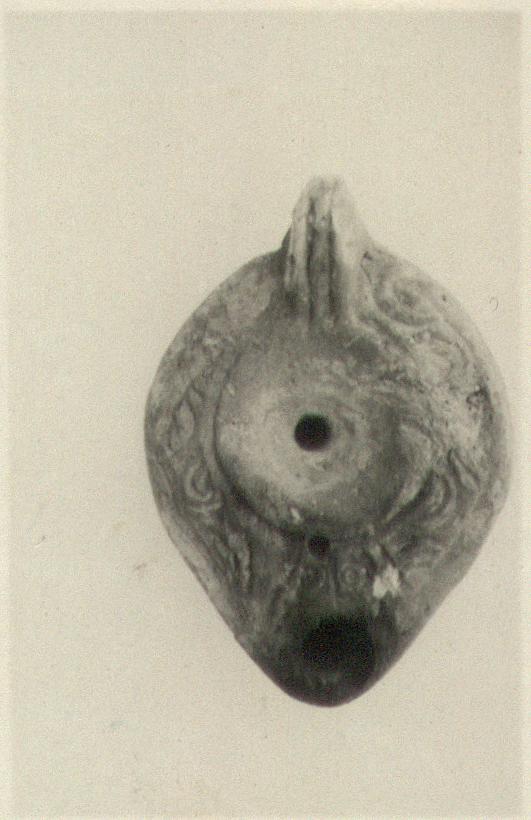 | Description: | On rim, wavy lines. On discus, double groove around central filling hole. Nozzle, with dots inside grooves. Handle solid, double grooved. On bottom, double almond-shaped grooves enclosing palm branch. Coarse pinkish-buff clay with pinkish slip (?). Type XXVIII of Corinth collection. ADDENDA For nozzle cf. Corinth IV, ii, p. 105, fig. 49, no. 2. | |