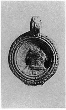 | Description: | The nozzle missing. Pierced handle, double grooved above; raised nodules around the narrow rim, then ridges. A head to the left in relief in the discus. Grooves and ridges on the reverse; cross grooves on base of handle. Traces of whitish slip or paint over all. Buff clay. Uncertain type. | |
