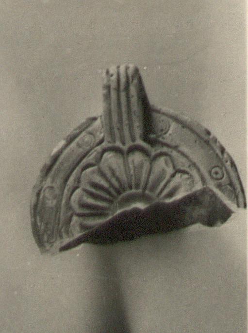 | Description: | Front half of lamp missing. Rim has two concentric grooves, with triple grooved stamped circles either side of rim, as panels. Rosette on discus. Solid handle triply grooved in front, doubly behind. Circular reverse with two concentric grooves enclosing letter: "C". Darker, red glaze wash. Light red clay. Type XXVIII of Corinth collection. | |