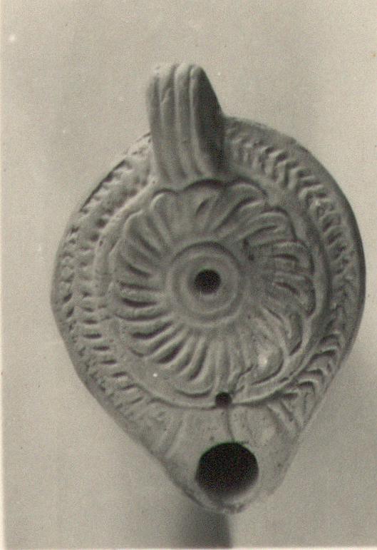 | Description: | Intact. Herringbone pattern on rim; whirling rosette on discus. Solid handle triply grooved in front and behind. Circular reverse enclosed by two concentric grooves. Faint traces of stamped circle in center. Unglazed. Light red to yellow clay. Type XXVIII of Corinth collection. | |
