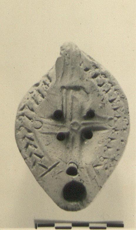 | Description: | Intact. Herringbone pattern on rim; Christian monogram with "rho" to right on discus. Solid handle, doubly grooved in front and behind. Almond-shaped reverse enclosed by groove around letters. Unglazed. Light red clay. Type XXVIII of Corinth collection. <graphic> | |