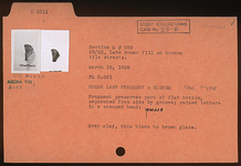 | Description: | Fragment preserves part of flat bottom, separated from side by groove. Raised letters in a stamped band. Thin black to brown glaze. Gray clay. | |