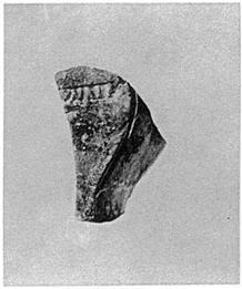 | Description: | Fragment preserves part of flat bottom, separated from side by groove. Raised letters in a stamped band. Thin black to brown glaze. Gray clay. | |