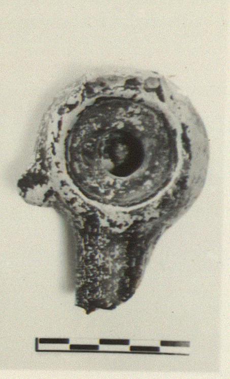 | Description: | Handle and tip of nozzle missing. Low base, angular body, deeply depressed top, knob at side. Wheel made. Black glaze, somewhat peeled. Pinkish-buff clay. Type XII (late straight variety) of Corinth collection, type 35A of Agora collection. | |