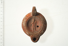 | Description: | Intact. On discus in relief, figure of nude youth facing his right hand on his mouth, his left holding a cornucopia. High headdress. Harpocrates (?). Plain rim with grooves at inner edge, and two small impressed circles at junction with nozzle. Handle double grooved above, plain below. Single groove around reverse. Red glaze over white slip. Type XXV of Corinth collection. | |
