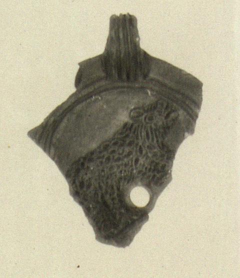 | Description: | Fragment of discus and back. Rim, plain, with double groove round inner edge. On discus, bear, standing, right; off axis; filling hole under body. Handle solid, triple grooved above, double below. On bottom, palm branch within double circular groove. Red lustrous wash. Buff clay. Type XXVIII of Corinth collection. | |