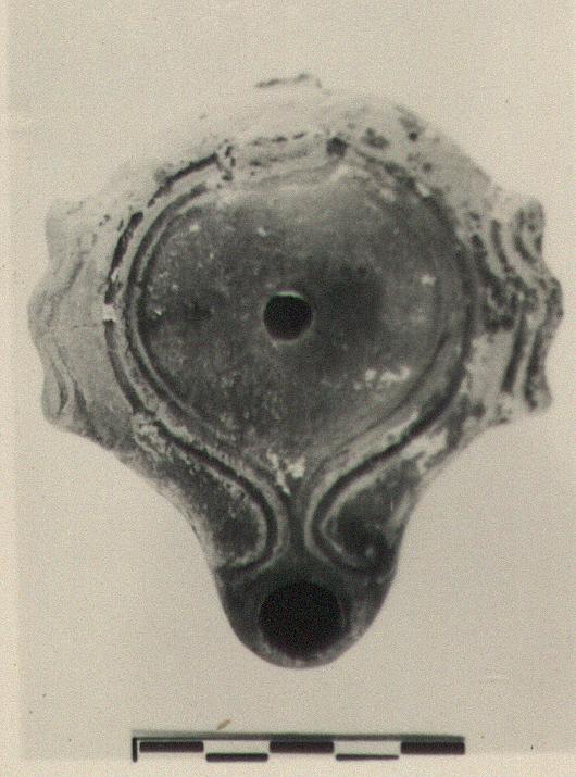 | Description: | Loop handle missing; otherwise intact. Narrow rim with ridged lugs at sides; plain discus; on reverse in relief: "alpha". Traces of dark glaze. Brick-red clay. Type XXIV of Corinth collection. | |
