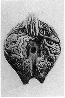Discus plain, small, rectangular, with wavy edge; connected with nozzle. Rim broad with leaf pattern. Handle unpierced; three grooves above and below. Reverse, within two circular grooves a large "E".