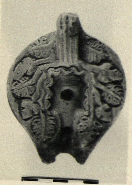 | Description: | End of nozzle broken, otherwise intact. Discus plain, small, rectangular, with wavy edge; connected with nozzle. Rim broad with leaf pattern. Handle unpierced; three grooves above and below. Reverse, within two circular grooves a large "E". Glaze thin, dull, purplish to brownish. Type XXVIII of Corinth collection. | |