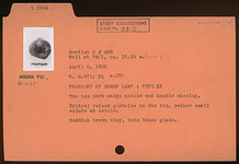 | Description: | The top part only; nozzle and handle missing. Typical raised globules on the top, rather small volute at nozzle. Thin black glaze. Reddish-brown clay. Type XX of Corinth collection. | |
