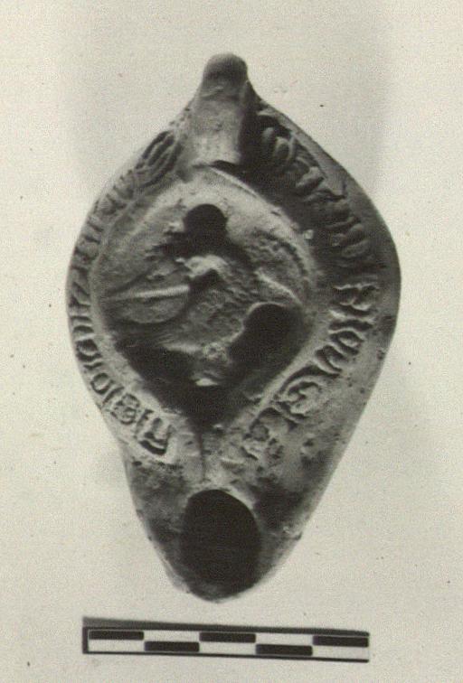 | Description: | Intact. Rim, sloping down and out, decorated with crude raised bars and blobs; discus, bird right, head turned back left. Solid knob-handle. On reverse, low ring, connected with handle by raised band. Red clay. Type XXXI of Corinth collection. | |