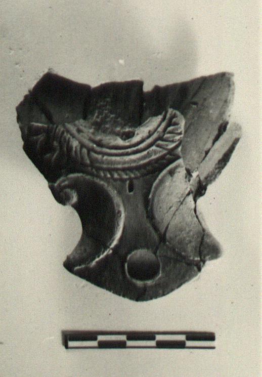 | Description: | Part of front preserved. Broad triangular nozzle with volutes at sides; ovules on rim at side; same line continues across line of nozzle as twisted cord. Similar ridge of twisted cord separates discus from rim. Grooves at outer edge of discus. Flat bottom. Traces of thin red to purple wash. Gritty red-brown clay. Type XXII of Corinth collection. | |